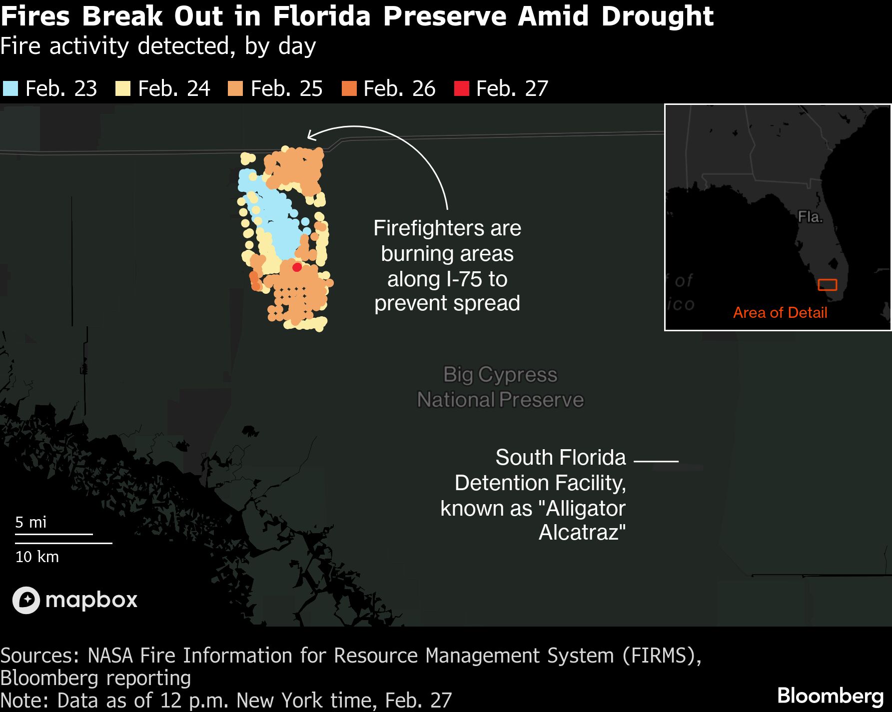 Fire risk in the preserve has ramped up since a historic deep freeze hit Florida in late January, which brought rare snow and left citrus groves tinged with damaging frost. Temperatures in the state plunged low enough to kill off small plants and grasses that are now tinder-dry and rapidly burning, said Michelle Lewis, a public information officer for the preserve. Winds picked up early in the week, fanning the blaze.
