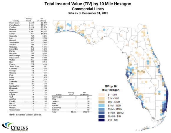 While the number of commercial and commercial residential Citizens policies at issue is relatively small and getting smaller—less than 6,200 as of early this year—the stakes are high for insurance agents and brokers who place commercial policies in the state. Data from Citizens show that the total insured value of Citizens’ commercial policies in the state is more than $25 billion.
