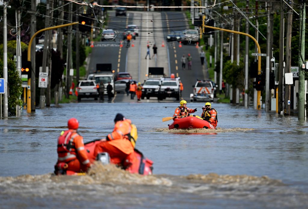Photograph: Emergency workers patrol a flooded area as they evacuate residents in the Melbourne suburb of Maribyrnong, in 2022. Photo credit: William West/AFP/Getty Images