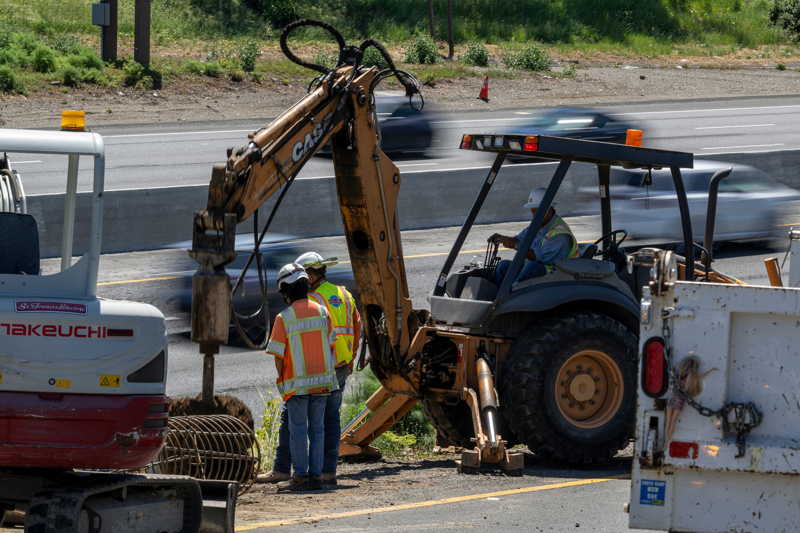 Top photo: Contractors install traffic control lights on an on-ramp to west bound Interstate 80 in El Cerrito, California, on Monday, May 5, 2025. Photographer: David Paul Morris/Bloomberg.