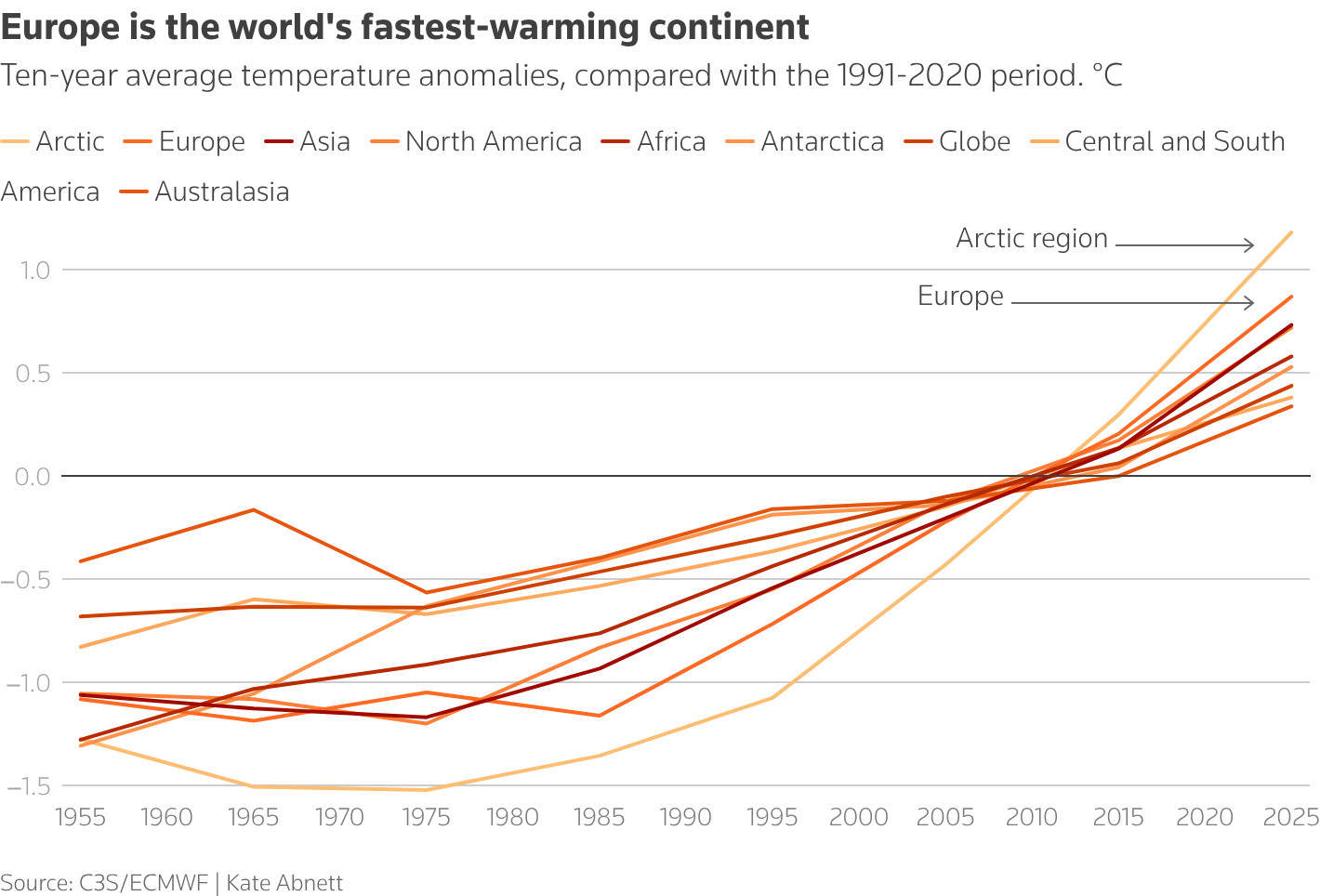 Europe is the world’s fastest-warming continent. The WMO and Copernicus said more than half of Europe was hit by drought conditions in May 2025, and the year overall was one of the three driest for soil moisture since 1992, as the warming climate imposes harsher conditions on farmers.