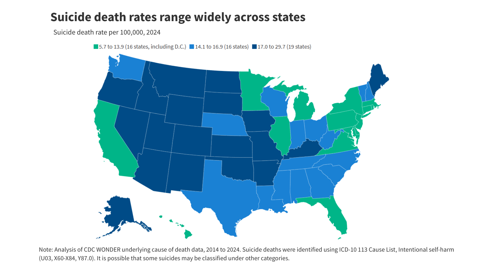 State variation: State suicide death rates in 2024 ranged from 5.7 per 100,000 in Washington D.C. to 29.7 in Alaska. About four in ten states had stable or lower rates than in 2014, while rates increased in the remaining states, ranging from a 27% decrease in Washington D.C. to a 35% increase in Wyoming. Rates tended to be higher in many Western states, while lower rates were more common in parts of the Northeast and a few coastal states.